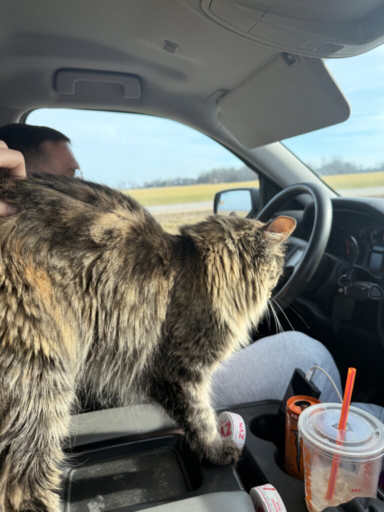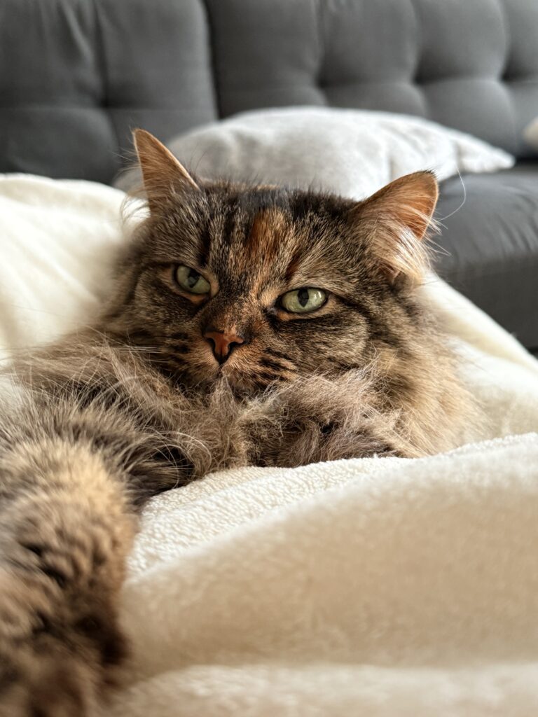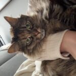 Domestic long hair. Brownish/grey/black. She is strictly indoor and will probably be very scared. She has a orange spot on her forehead and a tiny white spot on her nose