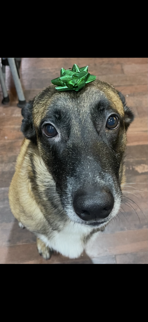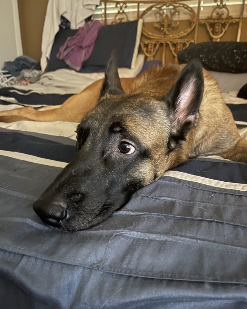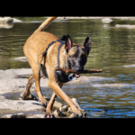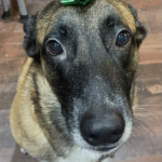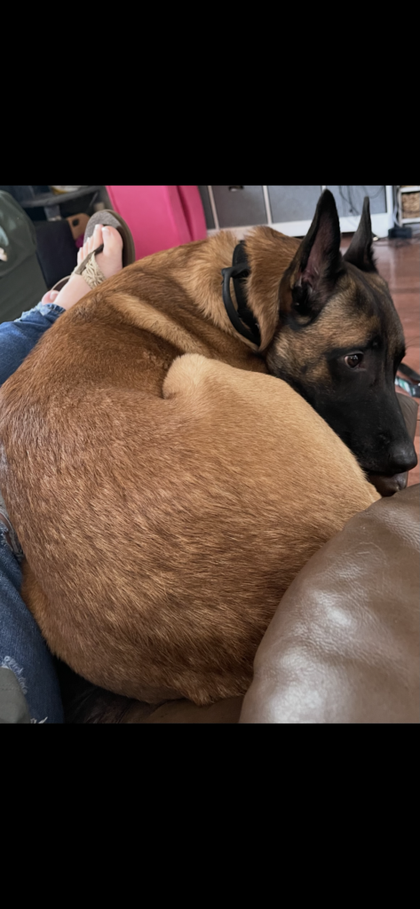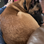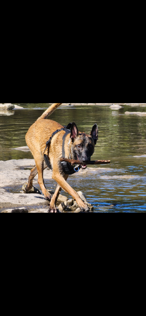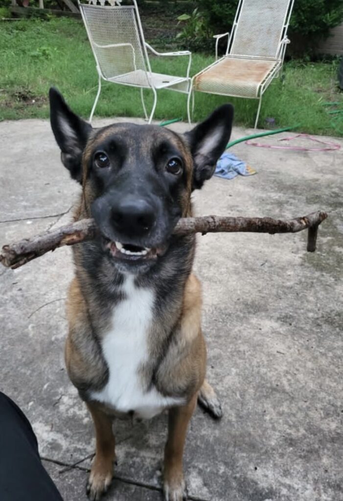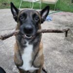 He is a brown Belgian Malinois with a white patch on his chest. He has a black face. He had a small scar on his nose from a cat scratch. He has some grey around his nose. He is an intact male, and he is not microchipped. He was wearing a simple silver chain when he went missing.