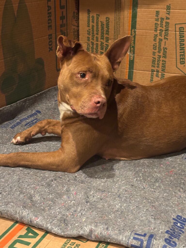 She appears to be a **female pit bull mix**, approximately **3 years old**, and **medium size (about 40–50 lbs)**.